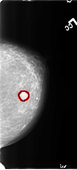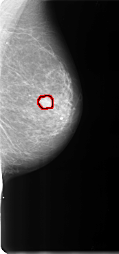 FILE: B_3091_1.LEFT_CC.OVERLAY TOTAL_ABNORMALITIES 1 ABNORMALITY 1 LESION_TYPE CALCIFICATION TYPE PLEOMORPHIC DISTRIBUTION CLUSTERED LESION_TYPE MASS SHAPE IRREGULAR MARGINS ILL_DEFINED ASSESSMENT 4 SUBTLETY 5 PATHOLOGY BENIGN TOTAL_OUTLINES 1 BOUNDARY |