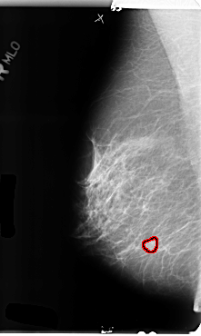 FILE: B_3146_1.RIGHT_CC.OVERLAY TOTAL_ABNORMALITIES 1 ABNORMALITY 1 LESION_TYPE MASS SHAPE LOBULATED MARGINS CIRCUMSCRIBED ASSESSMENT 4 SUBTLETY 4 PATHOLOGY BENIGN TOTAL_OUTLINES 1 BOUNDARY |