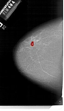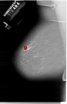 FILE: A_1275_1.LEFT_MLO.OVERLAY TOTAL_ABNORMALITIES 1 ABNORMALITY 1 LESION_TYPE CALCIFICATION TYPE PLEOMORPHIC DISTRIBUTION CLUSTERED ASSESSMENT 4 SUBTLETY 3 PATHOLOGY BENIGN TOTAL_OUTLINES 1 BOUNDARY |