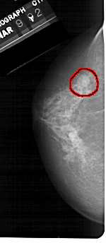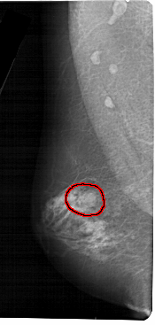FILE: A_1317_1.LEFT_CC.OVERLAY TOTAL_ABNORMALITIES 1 ABNORMALITY 1 LESION_TYPE MASS SHAPE ROUND MARGINS CIRCUMSCRIBED ASSESSMENT 4 SUBTLETY 3 PATHOLOGY BENIGN TOTAL_OUTLINES 1 BOUNDARY |