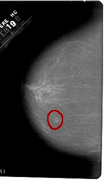 FILE: A_1346_1.LEFT_CC.OVERLAY TOTAL_ABNORMALITIES 1 ABNORMALITY 1 LESION_TYPE MASS SHAPE OVAL MARGINS ILL_DEFINED ASSESSMENT 4 SUBTLETY 4 PATHOLOGY BENIGN TOTAL_OUTLINES 1 BOUNDARY |