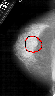 FILE: A_1396_1.LEFT_CC.OVERLAY TOTAL_ABNORMALITIES 1 ABNORMALITY 1 LESION_TYPE MASS SHAPE ROUND MARGINS OBSCURED ASSESSMENT 4 SUBTLETY 3 PATHOLOGY BENIGN TOTAL_OUTLINES 1 BOUNDARY |