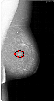 FILE: A_1435_1.RIGHT_CC.OVERLAY TOTAL_ABNORMALITIES 1 ABNORMALITY 1 LESION_TYPE MASS SHAPE OVAL MARGINS ILL_DEFINED ASSESSMENT 4 SUBTLETY 4 PATHOLOGY BENIGN TOTAL_OUTLINES 1 BOUNDARY |
