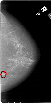FILE: A_1457_1.RIGHT_CC.OVERLAY TOTAL_ABNORMALITIES 1 ABNORMALITY 1 LESION_TYPE MASS SHAPE LOBULATED MARGINS CIRCUMSCRIBED ASSESSMENT 4 SUBTLETY 4 PATHOLOGY BENIGN TOTAL_OUTLINES 1 BOUNDARY |