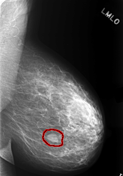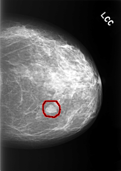 FILE: C_0332_1.LEFT_CC.OVERLAY TOTAL_ABNORMALITIES 1 ABNORMALITY 1 LESION_TYPE MASS SHAPE LOBULATED MARGINS CIRCUMSCRIBED ASSESSMENT 3 SUBTLETY 5 PATHOLOGY BENIGN TOTAL_OUTLINES 1 BOUNDARY |
