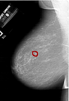 FILE: A_1492_1.LEFT_CC.OVERLAY TOTAL_ABNORMALITIES 1 ABNORMALITY 1 LESION_TYPE CALCIFICATION TYPE PUNCTATE DISTRIBUTION CLUSTERED ASSESSMENT 4 SUBTLETY 3 PATHOLOGY BENIGN TOTAL_OUTLINES 1 BOUNDARY |