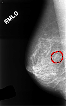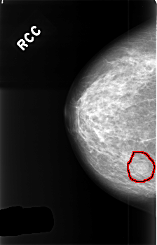 FILE: C_0371_1.RIGHT_CC.OVERLAY TOTAL_ABNORMALITIES 1 ABNORMALITY 1 LESION_TYPE MASS SHAPE ROUND MARGINS CIRCUMSCRIBED ASSESSMENT 4 SUBTLETY 5 PATHOLOGY BENIGN TOTAL_OUTLINES 1 BOUNDARY |