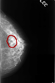 FILE: C_0378_1.LEFT_CC.OVERLAY TOTAL_ABNORMALITIES 1 ABNORMALITY 1 LESION_TYPE MASS SHAPE LOBULATED MARGINS OBSCURED ASSESSMENT 4 SUBTLETY 2 PATHOLOGY BENIGN TOTAL_OUTLINES 1 BOUNDARY |