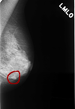 FILE: C_0395_1.LEFT_CC.OVERLAY TOTAL_ABNORMALITIES 1 ABNORMALITY 1 LESION_TYPE MASS SHAPE LOBULATED MARGINS CIRCUMSCRIBED ASSESSMENT 3 SUBTLETY 4 PATHOLOGY BENIGN TOTAL_OUTLINES 1 BOUNDARY |