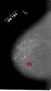 FILE: A_1719_1.LEFT_CC.OVERLAY TOTAL_ABNORMALITIES 1 ABNORMALITY 1 LESION_TYPE MASS SHAPE LOBULATED MARGINS MICROLOBULATED ASSESSMENT 4 SUBTLETY 3 PATHOLOGY BENIGN TOTAL_OUTLINES 1 BOUNDARY |