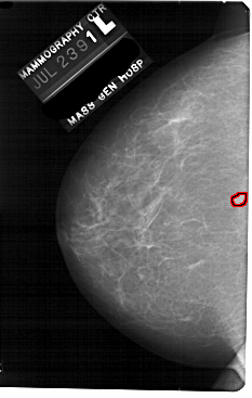 FILE: A_1738_1.LEFT_CC.OVERLAY TOTAL_ABNORMALITIES 1 ABNORMALITY 1 LESION_TYPE MASS SHAPE LOBULATED MARGINS ILL_DEFINED ASSESSMENT 4 SUBTLETY 2 PATHOLOGY BENIGN TOTAL_OUTLINES 1 BOUNDARY |