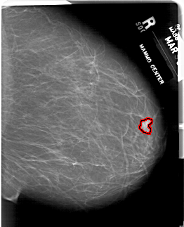 FILE: A_1815_1.RIGHT_CC.OVERLAY TOTAL_ABNORMALITIES 1 ABNORMALITY 1 LESION_TYPE MASS SHAPE TUBULAR MARGINS CIRCUMSCRIBED ASSESSMENT 4 SUBTLETY 4 PATHOLOGY BENIGN TOTAL_OUTLINES 1 BOUNDARY |