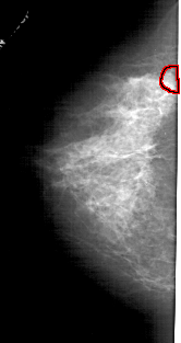 FILE: A_1890_1.LEFT_CC.OVERLAY TOTAL_ABNORMALITIES 1 ABNORMALITY 1 LESION_TYPE MASS SHAPE ROUND MARGINS OBSCURED ASSESSMENT 4 SUBTLETY 4 PATHOLOGY BENIGN TOTAL_OUTLINES 1 BOUNDARY |