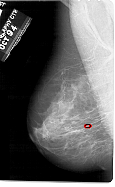 FILE: A_1945_1.LEFT_MLO.OVERLAY TOTAL_ABNORMALITIES 1 ABNORMALITY 1 LESION_TYPE CALCIFICATION TYPE PLEOMORPHIC DISTRIBUTION CLUSTERED ASSESSMENT 4 SUBTLETY 2 PATHOLOGY BENIGN TOTAL_OUTLINES 1 BOUNDARY |