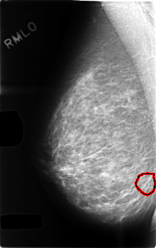 FILE: C_0493_1.RIGHT_MLO.OVERLAY TOTAL_ABNORMALITIES 1 ABNORMALITY 1 LESION_TYPE CALCIFICATION TYPE AMORPHOUS DISTRIBUTION CLUSTERED ASSESSMENT 4 SUBTLETY 2 PATHOLOGY BENIGN TOTAL_OUTLINES 1 BOUNDARY |
