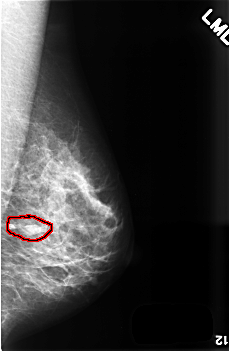FILE: C_0507_1.LEFT_CC.OVERLAY TOTAL_ABNORMALITIES 1 ABNORMALITY 1 LESION_TYPE MASS SHAPE LOBULATED MARGINS CIRCUMSCRIBED ASSESSMENT 3 SUBTLETY 5 PATHOLOGY BENIGN TOTAL_OUTLINES 1 BOUNDARY |