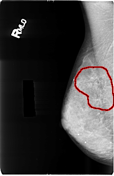 FILE: B_3496_1.RIGHT_MLO.OVERLAY TOTAL_ABNORMALITIES 1 ABNORMALITY 1 LESION_TYPE CALCIFICATION TYPE PUNCTATE-AMORPHOUS DISTRIBUTION REGIONAL ASSESSMENT 4 SUBTLETY 4 PATHOLOGY BENIGN TOTAL_OUTLINES 1 BOUNDARY |