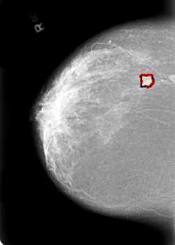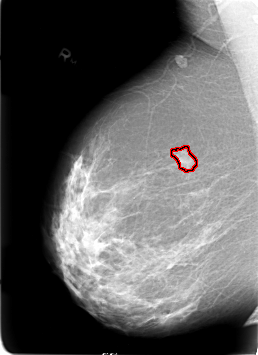 FILE: B_3020_1.RIGHT_CC.OVERLAY TOTAL_ABNORMALITIES 1 ABNORMALITY 1 LESION_TYPE MASS SHAPE LOBULATED MARGINS CIRCUMSCRIBED-ILL_DEFINED ASSESSMENT 4 SUBTLETY 4 PATHOLOGY MALIGNANT TOTAL_OUTLINES 1 BOUNDARY |