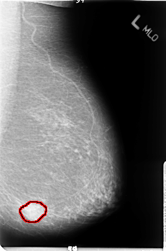 FILE: B_3049_1.RIGHT_MLO.OVERLAY TOTAL_ABNORMALITIES 1 ABNORMALITY 1 LESION_TYPE CALCIFICATION TYPE PLEOMORPHIC DISTRIBUTION CLUSTERED ASSESSMENT 4 SUBTLETY 4 PATHOLOGY BENIGN TOTAL_OUTLINES 1 BOUNDARY |