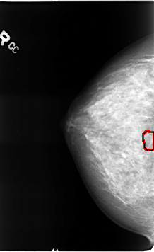 FILE: B_3079_1.RIGHT_CC.OVERLAY TOTAL_ABNORMALITIES 1 ABNORMALITY 1 LESION_TYPE CALCIFICATION TYPE PLEOMORPHIC DISTRIBUTION CLUSTERED ASSESSMENT 4 SUBTLETY 4 PATHOLOGY MALIGNANT TOTAL_OUTLINES 1 BOUNDARY |