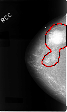 FILE: C_0022_1.RIGHT_CC.OVERLAY TOTAL_ABNORMALITIES 1 ABNORMALITY 1 LESION_TYPE CALCIFICATION TYPE AMORPHOUS DISTRIBUTION CLUSTERED LESION_TYPE MASS SHAPE IRREGULAR MARGINS MICROLOBULATED ASSESSMENT 5 SUBTLETY 5 PATHOLOGY MALIGNANT TOTAL_OUTLINES 1 BOUNDARY |