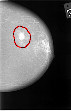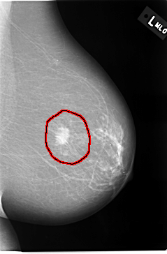 FILE: C_0037_1.LEFT_CC.OVERLAY TOTAL_ABNORMALITIES 1 ABNORMALITY 1 LESION_TYPE MASS SHAPE IRREGULAR MARGINS ILL_DEFINED ASSESSMENT 5 SUBTLETY 5 PATHOLOGY MALIGNANT TOTAL_OUTLINES 1 BOUNDARY |