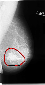 FILE: C_0050_1.LEFT_CC.OVERLAY TOTAL_ABNORMALITIES 1 ABNORMALITY 1 LESION_TYPE MASS SHAPE IRREGULAR MARGINS SPICULATED ASSESSMENT 5 SUBTLETY 5 PATHOLOGY MALIGNANT TOTAL_OUTLINES 1 BOUNDARY |