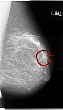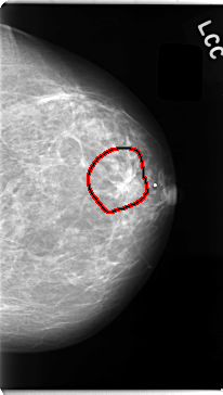FILE: C_0059_1.LEFT_CC.OVERLAY TOTAL_ABNORMALITIES 1 ABNORMALITY 1 LESION_TYPE MASS SHAPE IRREGULAR MARGINS SPICULATED ASSESSMENT 5 SUBTLETY 5 PATHOLOGY MALIGNANT TOTAL_OUTLINES 1 BOUNDARY |