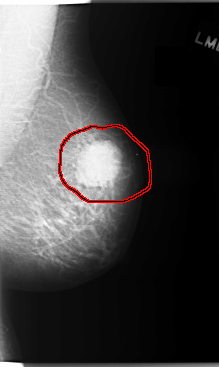 FILE: C_0088_1.LEFT_CC.OVERLAY TOTAL_ABNORMALITIES 1 ABNORMALITY 1 LESION_TYPE MASS SHAPE OVAL MARGINS MICROLOBULATED ASSESSMENT 5 SUBTLETY 5 PATHOLOGY MALIGNANT TOTAL_OUTLINES 1 BOUNDARY |