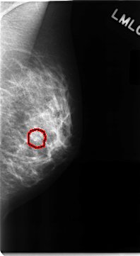 FILE: C_0090_1.LEFT_MLO.OVERLAY TOTAL_ABNORMALITIES 1 ABNORMALITY 1 LESION_TYPE CALCIFICATION TYPE PLEOMORPHIC DISTRIBUTION CLUSTERED ASSESSMENT 4 SUBTLETY 4 PATHOLOGY MALIGNANT TOTAL_OUTLINES 1 BOUNDARY |