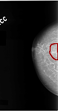 FILE: C_0099_1.RIGHT_CC.OVERLAY TOTAL_ABNORMALITIES 1 ABNORMALITY 1 LESION_TYPE CALCIFICATION TYPE PLEOMORPHIC DISTRIBUTION CLUSTERED ASSESSMENT 5 SUBTLETY 5 PATHOLOGY MALIGNANT TOTAL_OUTLINES 1 BOUNDARY |
