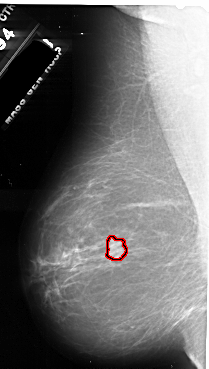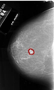 FILE: A_1055_1.LEFT_CC.OVERLAY TOTAL_ABNORMALITIES 1 ABNORMALITY 1 LESION_TYPE MASS SHAPE IRREGULAR MARGINS SPICULATED ASSESSMENT 5 SUBTLETY 5 PATHOLOGY MALIGNANT TOTAL_OUTLINES 1 BOUNDARY |
