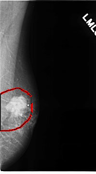 FILE: C_0141_1.LEFT_CC.OVERLAY TOTAL_ABNORMALITIES 1 ABNORMALITY 1 LESION_TYPE MASS SHAPE IRREGULAR MARGINS MICROLOBULATED ASSESSMENT 5 SUBTLETY 5 PATHOLOGY MALIGNANT TOTAL_OUTLINES 1 BOUNDARY |