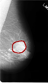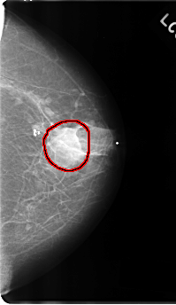 FILE: C_0177_1.LEFT_CC.OVERLAY TOTAL_ABNORMALITIES 1 ABNORMALITY 1 LESION_TYPE MASS SHAPE IRREGULAR MARGINS ILL_DEFINED ASSESSMENT 4 SUBTLETY 3 PATHOLOGY MALIGNANT TOTAL_OUTLINES 1 BOUNDARY |