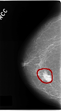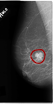 FILE: C_0181_1.RIGHT_CC.OVERLAY TOTAL_ABNORMALITIES 1 ABNORMALITY 1 LESION_TYPE MASS SHAPE IRREGULAR MARGINS SPICULATED ASSESSMENT 5 SUBTLETY 5 PATHOLOGY MALIGNANT TOTAL_OUTLINES 1 BOUNDARY |