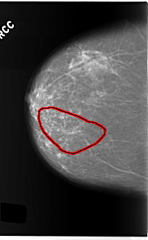 FILE: C_0214_1.RIGHT_CC.OVERLAY TOTAL_ABNORMALITIES 1 ABNORMALITY 1 LESION_TYPE CALCIFICATION TYPE PLEOMORPHIC DISTRIBUTION SEGMENTAL ASSESSMENT 4 SUBTLETY 4 PATHOLOGY MALIGNANT TOTAL_OUTLINES 1 BOUNDARY |