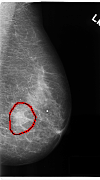 FILE: C_0216_1.LEFT_CC.OVERLAY TOTAL_ABNORMALITIES 1 ABNORMALITY 1 LESION_TYPE MASS SHAPE IRREGULAR MARGINS ILL_DEFINED ASSESSMENT 5 SUBTLETY 5 PATHOLOGY MALIGNANT TOTAL_OUTLINES 1 BOUNDARY |