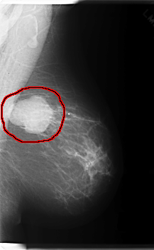 FILE: C_0219_1.LEFT_CC.OVERLAY TOTAL_ABNORMALITIES 1 ABNORMALITY 1 LESION_TYPE MASS SHAPE OVAL MARGINS CIRCUMSCRIBED ASSESSMENT 5 SUBTLETY 5 PATHOLOGY MALIGNANT TOTAL_OUTLINES 1 BOUNDARY |