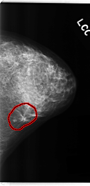 FILE: C_0222_1.LEFT_CC.OVERLAY TOTAL_ABNORMALITIES 1 ABNORMALITY 1 LESION_TYPE MASS SHAPE IRREGULAR MARGINS SPICULATED ASSESSMENT 5 SUBTLETY 5 PATHOLOGY MALIGNANT TOTAL_OUTLINES 1 BOUNDARY |