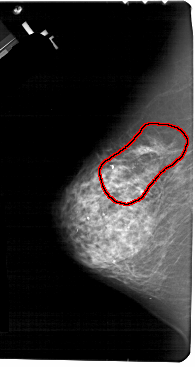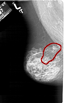 FILE: A_1510_1.LEFT_CC.OVERLAY TOTAL_ABNORMALITIES 1 ABNORMALITY 1 LESION_TYPE CALCIFICATION TYPE PLEOMORPHIC DISTRIBUTION REGIONAL LESION_TYPE MASS SHAPE IRREGULAR MARGINS SPICULATED ASSESSMENT 5 SUBTLETY 5 PATHOLOGY MALIGNANT TOTAL_OUTLINES 1 BOUNDARY |