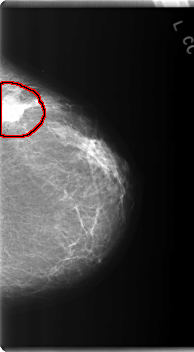 FILE: C_0220_1.LEFT_CC.OVERLAY TOTAL_ABNORMALITIES 1 ABNORMALITY 1 LESION_TYPE CALCIFICATION TYPE AMORPHOUS DISTRIBUTION CLUSTERED LESION_TYPE MASS SHAPE IRREGULAR MARGINS SPICULATED ASSESSMENT 5 SUBTLETY 5 PATHOLOGY MALIGNANT TOTAL_OUTLINES 1 BOUNDARY |