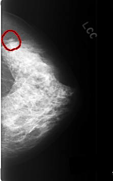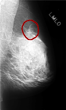 FILE: C_0358_1.LEFT_CC.OVERLAY TOTAL_ABNORMALITIES 1 ABNORMALITY 1 LESION_TYPE MASS SHAPE IRREGULAR MARGINS OBSCURED ASSESSMENT 5 SUBTLETY 3 PATHOLOGY MALIGNANT TOTAL_OUTLINES 1 BOUNDARY |