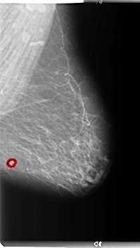 FILE: B_3089_1.LEFT_CC.OVERLAY TOTAL_ABNORMALITIES 1 ABNORMALITY 1 LESION_TYPE MASS SHAPE ROUND MARGINS CIRCUMSCRIBED ASSESSMENT 4 SUBTLETY 4 PATHOLOGY MALIGNANT TOTAL_OUTLINES 1 BOUNDARY |