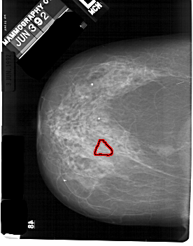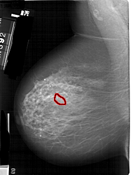 FILE: A_1824_1.LEFT_MLO.OVERLAY TOTAL_ABNORMALITIES 1 ABNORMALITY 1 LESION_TYPE CALCIFICATION TYPE PLEOMORPHIC DISTRIBUTION SEGMENTAL ASSESSMENT 4 SUBTLETY 3 PATHOLOGY MALIGNANT TOTAL_OUTLINES 1 BOUNDARY |