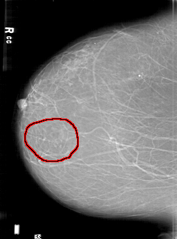 FILE: D_4190_1.RIGHT_MLO.OVERLAY TOTAL_ABNORMALITIES 1 ABNORMALITY 1 LESION_TYPE CALCIFICATION TYPE FINE_LINEAR_BRANCHING DISTRIBUTION CLUSTERED ASSESSMENT 0 SUBTLETY 4 PATHOLOGY MALIGNANT TOTAL_OUTLINES 1 BOUNDARY |