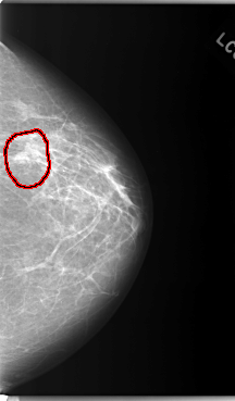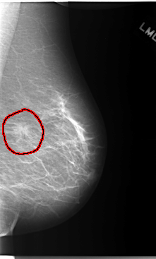 FILE: C_0103_1.LEFT_CC.OVERLAY TOTAL_ABNORMALITIES 1 ABNORMALITY 1 LESION_TYPE MASS SHAPE IRREGULAR MARGINS ILL_DEFINED ASSESSMENT 5 SUBTLETY 4 PATHOLOGY MALIGNANT TOTAL_OUTLINES 1 BOUNDARY |