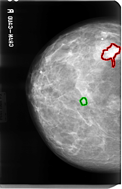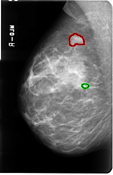 FILE: B_3040_1.RIGHT_MLO.OVERLAY TOTAL_ABNORMALITIES 2 ABNORMALITY 1 LESION_TYPE MASS SHAPE IRREGULAR MARGINS SPICULATED ASSESSMENT 4 SUBTLETY 4 PATHOLOGY MALIGNANT TOTAL_OUTLINES 1 BOUNDARY ABNORMALITY 2 LESION_TYPE MASS SHAPE OVAL MARGINS CIRCUMSCRIBED ASSESSMENT 3 SUBTLETY 3 PATHOLOGY UNPROVEN TOTAL_OUTLINES 1 BOUNDARY |