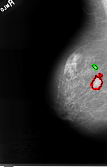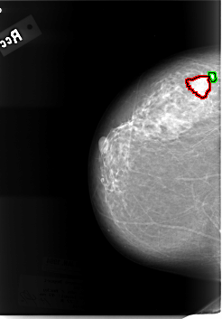FILE: B_3060_1.RIGHT_CC.OVERLAY TOTAL_ABNORMALITIES 2 ABNORMALITY 1 LESION_TYPE MASS SHAPE IRREGULAR MARGINS SPICULATED ASSESSMENT 4 SUBTLETY 5 PATHOLOGY MALIGNANT TOTAL_OUTLINES 1 BOUNDARY ABNORMALITY 2 LESION_TYPE CALCIFICATION TYPE PLEOMORPHIC DISTRIBUTION CLUSTERED ASSESSMENT 4 SUBTLETY 4 PATHOLOGY UNPROVEN TOTAL_OUTLINES 1 BOUNDARY |