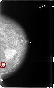 FILE: B_3512_1.LEFT_CC.OVERLAY TOTAL_ABNORMALITIES 1 ABNORMALITY 1 LESION_TYPE CALCIFICATION TYPE PLEOMORPHIC DISTRIBUTION CLUSTERED LESION_TYPE MASS SHAPE IRREGULAR-ARCHITECTURAL_DISTORTION MARGINS SPICULATED ASSESSMENT 5 SUBTLETY 4 PATHOLOGY MALIGNANT TOTAL_OUTLINES 1 BOUNDARY |