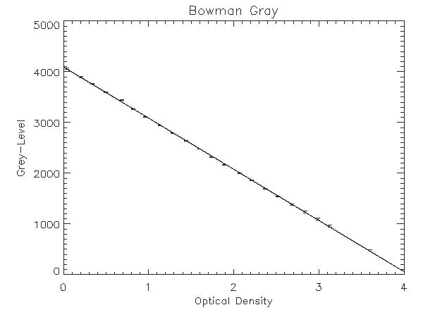 Example: Using Equation 2, a grey level of 2478 maps to an optical density of 1.6045. Looking at the table of measured OD values, we see the a grey level of 2478 mapped to a measured optical density of 1.59. Using the information provided with the Lumisys scanner (Eq. 1), a grey level of 2478 maps to an optical density of 1.617. The small discrepancies can be attributed to some combination of the noise introduced by the digitization process, and the noise in the experimental measurement of the OD function.